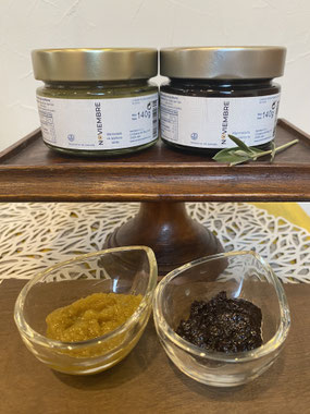 早摘み緑果のオリーブと完熟の黒オリーブの実を、それぞれ果肉をたっぷりと入れて、オリーブ果実から出るエキストラバージンオリーブオイルもそのままに、美味しいジャムに仕上げています。パンはもちろん、お肉のソースや、チーズのお供に、ヴィネガーや柑橘果汁を加えてドレッシングとしても楽しめます。
