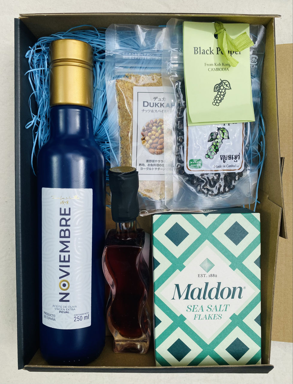 エキストラバージンオリーブオイル250ml、マルドンシーソルト125g、デュカ(オリジナルミックス)40g、コラトゥーラ・ディ・アリーチ40ml